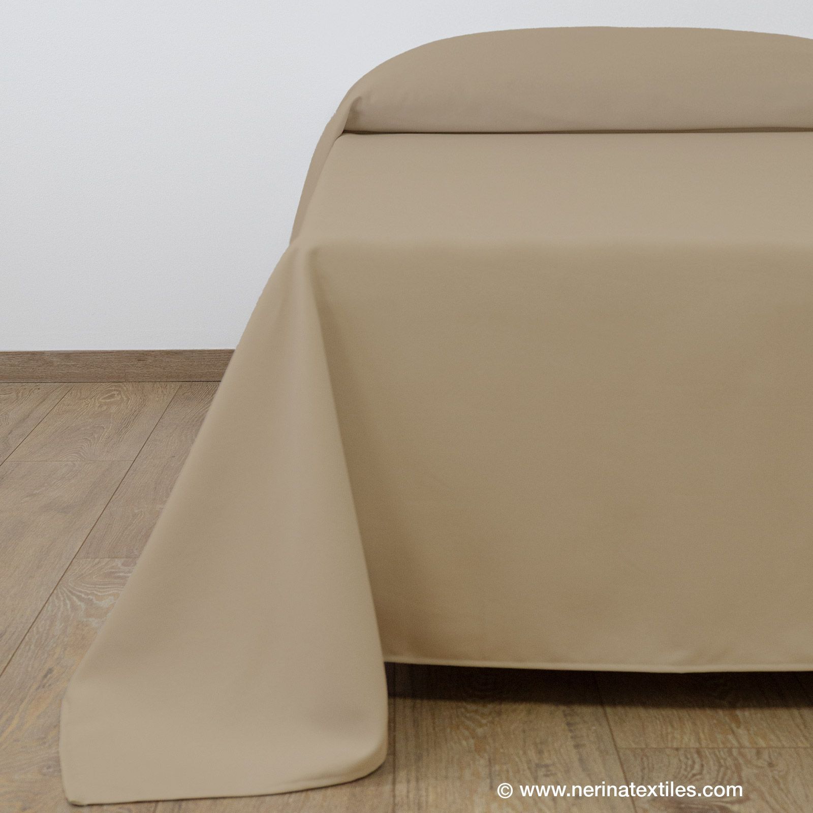 Colcha fabricada con tejido Panamá 60% algodón y 40% poliéster de 246 g/m2 en color guijarro.